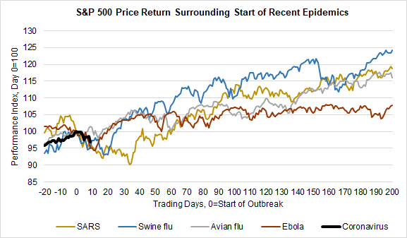 Source: FocusPoint Solutions calculations, based on index returns from Yahoo Finance. Epidemic start dates: SARS (1/21/03), Swine flu (6/11/09), Avian flu (3/31/13), Ebola (9/30/14), as defined by Goldman Sachs Investment Research. Coronavirus start date set as 1/17/20, with returns through 1/31/20.